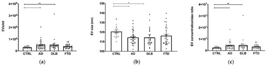 Current results of the association of the EV concentration/size ratio with the p-Tau 181/Aβ 42 ratio, as CSF biomarkers of AD [42], are in this direction. The EV concentration/size ratio with the p-Tau 181/Aβ 42 ratio correlation was found for the entire PTS group but the stratified analysis for dementia diagnostic categories revealed that this effect was driven by the AD group. In general, our results show a slight difference in EV variables in FTD with respect to AD and DLB.