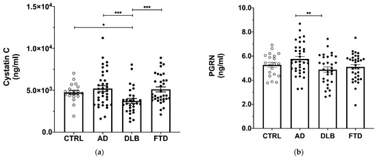 3.2. Cystatin C and Progranulin CSF Are Altered in DLB and AD