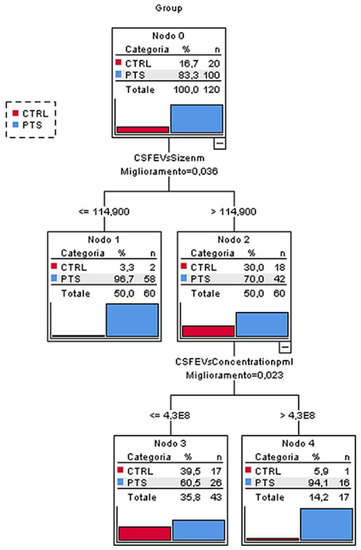 Classification tree. EV size resulted in being the most predictive variable among all the ones significantly associated to the groups. CTRL, controls; PTS, patients; CSFEVs size (nm), EV size (nm); CSFEVs concentration (p/mL), EV concentration (EVs/mL).