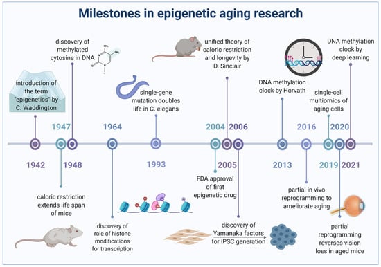 For a long time, aging was believed to be genetically determined [] and research focused on specific genes and pathways that could be targeted to prolong life. Back then, the finding that a mutation in the daf2 gene, encoding the insulin-like growth factor 1, was sufficient to double the lifespan in C. elegans [], was a huge milestone in aging research. However, with time perspectives on aging changed and it is now known that aging is not only accompanied by alterations in the epigenetic landscape, but also at least in part induced by those changes. Here, we present recent findings on epigenetic changes involving histone modifications and DNA methylation during aging and age-associated maladies such as neurodegeneration and cancer. In this regard, we also outline the emergence of DNA methylation clocks to determine biological aging. We will cover the utility of epigenetic signatures as biomarkers and the physiological implications of respective alterations. Age-associated metabolic dysregulation, which could underlie epigenetic changes, and other risk factors for age acceleration, will be described before we finally explore therapeutic interventions aiming to prevent age-associated maladies and to increase healthy life span including the emerging field of cellular reprogramming. Figure 1 illustrates some of the most relevant milestones that paved the long way from the onset of epigenetic research to the most recent intervention strategies targeting these complex mechanisms.