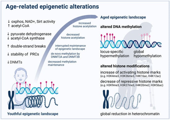 On the other hand, recent work demonstrated that accumulation of non-mutagenic double-strand breaks (DBS) results in an acceleration of age-related changes comprising physiological, cognitive, and molecular features as well as the epigenetic clock []. In transgenic “ICE” (inducible changes to the epigenome) mice, DBS induces the frequent recruitment of chromatin modifiers to sites that demand repair. Consequently, these modifiers are less available for maintenance of the epigenetic landscape eventually leading to the aberrant gene expression profiles seen in aged individuals []. In particular, with age regions of euchromatin were shown to lose the active H3K27ac mark, whereas regions of heterochromatin lose the repressive H3K27me3 mark resulting in a “flattened” epigenetic landscape []. Taken together, these studies implicate that epigenetic drift is a cause of aging rather than the driving force.