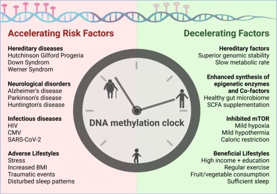 Pathologies that are known to accelerate biological aging such as Down syndrome [], Werner’s syndrome [], and Hutchinson Gilford Progeria Syndrome [] have been reported to be accompanied with epigenetic age acceleration, thus supporting the physiological relevance of DNAm-based epigenetic clocks. There are a great number of pre-existing conditions that are associated with an acceleration of epigenetic aging. Neurodegenerative diseases such as Alzheimer’s disease [], Parkinson’s disease [] and Huntington’s disease [] are all associated with accelerated epigenetic age. However, due to the genetic contribution to the pathogenesis of these disorders, it is hard to distinguish cause and effect with respect to the differential methylation patterns underlying the age acceleration. For example, in Alzheimer’s disease, some DNA methylation changes precede the onset of pathological conditions as discussed before []. Results are more straightforward when it comes to acquired infectious diseases. Chronic infections triggered by either the human immunodeficiency virus (HIV) [] or cytomegalovirus (CMV) [] have been reported to be associated with accelerated epigenetic aging and thus can be considered definite risk factors. Notably, evidence for an epigenetic age acceleration was also proposed after a transient infection with SARS-CoV-2 (COVID-19), though it was only traceable in younger patients []. However, since long-term effects of COVID-19 are still to be determined it is not clear whether this impact on the DNA methylation landscape will persist and in turn poses an actual risk factor for a decreased life expectancy.