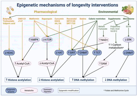 Yet, as metabolism and aging are known to be highly interrelated, much research on interventions is focused on this particular lever []. Additionally, intermittent fasting and an altered diet with respect to certain nutrients and supplements emerged as alternatives to calorie restriction for humans. The underlying mechanisms of diet interventions involve metabolic signaling pathways such as insulin/IGF1, mTOR, AMPK, sirtuin and FOXO pathways, which are recently known to interact with epigenetic mechanisms []. For example, mTOR signaling governs serine and one-carbon metabolism which provide SAM as methyl group donor for DNA methylation [], while some sirtuins not only act as signaling proteins but also as histone deacetylases. As such, SIRT1 expression was shown to be implicated in calorie restriction induced life span extension []. Indeed, dietary intervention in rats resulted in increased SIRT1 expression and reduction of H4K16ac []. Interestingly, the levels of histone 3 modifications such as H3K9, H3K27, and H3K56 were increased []. Similarly, caloric restriction in old mice resulted in increased liver SIRT1 activation and increased H3K9/K14ac and H3K27ac in circadian-regulated genes []. Notably, malate and fumarate supplementation was shown to increase life span in worms and the authors speculate that such additions can impact acetyl-CoA and NAD+ levels, which in turn would affect histone acetylation levels [].