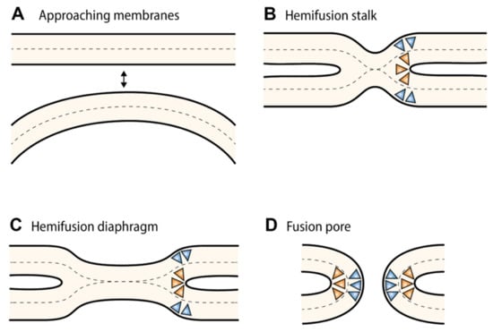 - Chernomordik, L.V.; Kozlov, M.M. Mechanics of Membrane Fusion. Nat. Struct. Mol. Biol. 2008, 15, 675–683. [Google Scholar] [CrossRef] [PubMed]