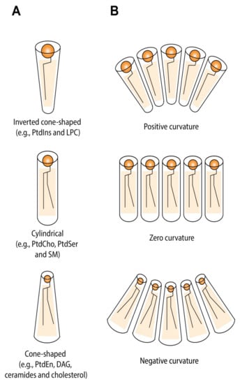 Based on the relative volumes of the head group and the incorporated acyl chains, membrane lipids can be roughly divided into three basic shapes, each forming monolayers with different spontaneous (or intrinsic) curvatures (Figure 3) [44]: lipids with small head groups relative to a large (often polyunsaturated) fatty acyl domain have a conical shape and bend towards the hydrophobic fatty acyl layer. Examples include phosphatidylethanolamine (PtdEtn), phosphatidic acid (PA), diacylglycerol (DAG), cardiolipin, and cholesterol. Conversely, lipids with bulky, charged head groups and saturated tails like phosphatidylinositol (PtdIns) and gangliosides, or only a single aliphatic tail, like lysophosphatidylcholine (LPC) tend to have an inverted-cone shape and curve spontaneously towards the polar head groups. Phosphatidylcholine (PtdCho), phosphatidylserine (PtdSer), and sphingomyelin (SM), which are characterized by a head group-to-acyl chain ratio roughly equal to 1, have a cylindrical shape and form an essentially flat monolayer. Accordingly, conical, inverted cone, and cylindrical shapes have negative, positive, and zero spontaneous curvatures, respectively.