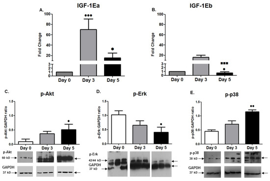 (A,B) IGF-1 isoforms’ expression during cardiomyoblasts differentiation. Quantitative analysis of IGF-1Ea and IGF-1Eb mRNA expression in cardiomyoblasts during their differentiation. (C–E) Alterations in the activation of the signalling proteins Akt, Erk1/2, and p38. Representative Western blots and immunoblotting quantification of p-Akt, p-Erk1/2, and p-p38phosphorylation in cardiomyoblasts during their differentiation process. The values of the phosphorylated proteins were normalized to each corresponding GAPDH on the same immunoblot. Significantly different compared to day 0, • p < 0.05; •• p < 0.01; ••• p < 0.001. Significantly different compared to day 3, ▪▪▪ p < 0.001. Mean + SE of three independent experiments performed in triplicate.
