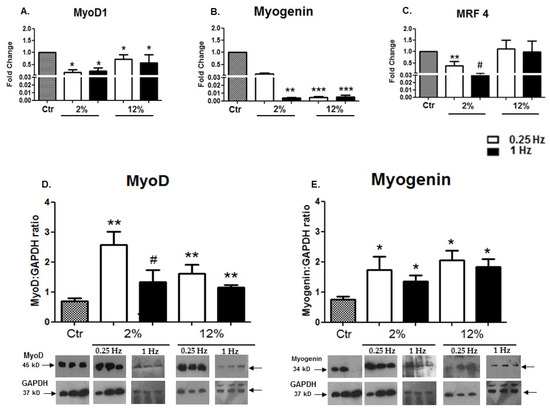 (A–C) Effects of cyclic mechanical loading on the expression of myogenic regulatory factors (MRFs). Quantitative analysis of transcriptional responses of (A) MyoD1, (B) Myogenin, and (C) MRF4 in differentiated cardiomyocytes subjected to different mechanical stretching protocols compared to the control (Ctr; nonstretched myotubes). (D,E) The mRNA values of MRFs in stretched myotubes have been normalized to the corresponding GAPDH mRNA and are expressed as fold changes compared to the control. Representative Western blots and immunoblotting quantification of MyoD (D) and Myogenin (E) subjected to the various mechanical loading conditions compared to the control; the proteins of interest were normalized to each corresponding GAPDH on the same immunoblot. The same blots have been used for GAPDH in Figure 3D,E, Figure 5C, and Figure 7A,B, except from the blot of GAPDH in panel A for the 2%/1 Hz stretching protocol. Significantly different compared to the control, * p < 0.05; ** p < 0.01; *** p < 0.001. Significantly different compared to the 2%/0.25 Hz stretching protocol, # p < 0.05. Mean + SE of three independent experiments performed in triplicate.