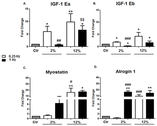 (A,B) Effects of mechanical stretching on the expression of the IGF-1 isoforms. Quantitative analysis of (A) IGF-1Ea and (B) IGF-1Eb mRNA levels in differentiated cardiomyocytes subjected to different mechanical stretching protocols compared to the control (Ctr; nonstretched myotubes). The transcriptional responses of IGF-1 isoforms in stretched cardiomyocytes have been normalized to the corresponding GAPDH values and are expressed as fold changes compared to the control. (C,D) Effects of mechanical stretch on the expression of muscle atrophy factors. Quantitative analysis of (C) Myostatin and (D) Atrogin 1 mRNA expression in differentiated cardiomyocytes subjected to the various mechanical loading conditions compared to the control (nonstretched myotubes); The mRNA values of the genes of interest in stretched myotubes have been normalized to the corresponding GAPDH mRNA and are expressed as fold changes compared to the control. Significantly different compared to the control, * p < 0.05; ** p < 0.01. Significantly different compared to the 2%/0.25 Hz stretching protocol, # p < 0.05; ## p < 0.01; ### p < 0.001. Significantly different compared to the 12%/ 0.25 Hz stretching protocol, $$ p < 0.01. Mean + SE of three independent experiments performed in triplicate.