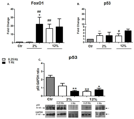 (A,B) Effects of mechanical loading on the expression of pro-apoptotic factors. Quantitative analysis of (A) FoxO1 and (B) p53 mRNA expression in differentiated cardiomyocytes subjected to various mechanical stretching protocols compared to the control (Ctr; nonstretched myotubes); the transcriptional responses of pro-apoptotic factors in stretched myotubes have been normalized to the corresponding GAPDH mRNA values and are expressed as fold changes compared to the control. (C) Representative Western blots and immunoblotting quantification of p53 subjected to the different stretching protocols compared to the control (nonstretched myotubes). The p53 protein levels were normalized to each corresponding GAPDH on the same immunoblot. The same blots have been used for GAPDH in Figure 3D,E, Figure 5C, and Figure 7A,B, except from the blot of GAPDH in panel A for the 2%/1 Hz stretching protocol, Significantly different compared to the control, * p < 0.05; ** p < 0.01. Significantly different compared to the 2%/0.25 Hz stretching protocol, # p < 0.05; ## p < 0.01. Mean + SE of three independent experiments performed in triplicate.