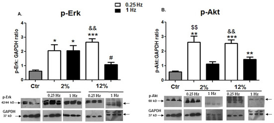 Lastly, two primary mechanosensitive intracellular pathways appear to require comprehensive identification of their interactions and outcomes within the context of cardiac and myogenic differentiation and their pathophysiological transfer to cardiomyopathy under mechanical stimuli [27,30,31,44]. Specifically, the activation of the phosphatidylinositol 3-kinase (PI3K)/Akt pathway has been implicated in myocardial cells’ survival and their protection against reperfusion-induced injury and apoptosis, while the Ras/Raf/Erk1/2 signalling pathway has been shown to be essential for myocardial hypertrophy [25]. Our previous work has shown a loading-specific activation of these two pathways in differentiated cardiomyocytes in vitro, with the intermediate-duration (12 h) stretching protocol being effective at inducing upregulation of both Erk1/2 and Akt pathways [29]. In the present study, we used this “optimum” intermediate duration of loading to further investigate the effects of frequency and strain variations on the activation of these major signalling pathways. Our new data further revealed that low-frequency loading of cardiomyoblasts may be, overall, more effective at the activation of the signalling mediators Erk1/2 and Akt compared to the high-frequency protocols, regardless of the strain features (Figure 7). These findings suggest that the loading-induced activation of these pathways is not mutually exclusive and may depend on the characteristics of mechanical loading.