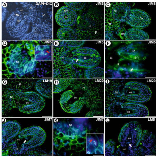 Together with hemicelluloses, pectins are an important polysaccharide component of the cell wall and have an effect on its properties (cell wall extensibility and porosity). Pectins play a role in many important processes, e.g., growth, morphogenesis, organogenesis, cell–cell adhesion, defense, leaf abscission and fruit and seed development, as well as ion binding. They can be divided into five main groups: homogalacturonan (HG), xylogalacturonan (XGA), apiogalacturonan (AP) and rhamnogalacturonan I and II [,,]. The methyl-esterification and demethyl-esterification of homogalacturonans are key in plant development and the plant lifecycle []. In seed plants, there is a specific dialogue between the sporophyte and gametophytes and between the male gametophyte and female gametophyte e.g., [,,,,]. The sporophytic tissues provide the specific ions and molecules that are necessary for the nutrition, attraction and guidance of the male gametophyte (pollen tube), including the calcium ions, arabinogalactan proteins (AGP) and homogalacturonans [,,,,,,,]. It is well known that homogalacturonans participate in the interaction between the pollen tube (the male gametophyte) and the pistil transmitting tract in various Angiospermae species [,,,,,,]. However, the role of the homogalacturonan in the final stage of the progamic phase and during fertilization has only been studied in a few genera and species [,,,]. Thus, comparative studies of a phylogenetically broad range of taxa are required in order to understand the diversity of the homogalacturonans and their functions in different types of ovules and gametophytes. Generally, there are pollination- and fertilization-induced changes in the occurrence of both highly and low methyl-esterified homogalacturonans in the pistil transmitting tract, the micropyle of the ovule and also in the apoplast of the embryo sac cells. For example, Niedojadło et al. [] showed that fertilization in Hyacinthus orientalis L. was followed by a change in the pectic composition in the filiform apparatus, the egg apparatus apoplast and also in the ‘‘micropylar’’ region of the central cell. The situation is more complicated in apomicts; Gawecki et al. [] did not observe an abundant occurrence of highly methyl-esterified HG, which is labeled by the JIM7 antibody in either the micropyle or the synergids of the apomictic Taraxacum. Kościńska-Pająk [] did not record HG (recognized by the JIM7 and JIM5 antibodies) in the micropylar part of the embryo sac, nor in the cytoplasm of the synergids in the apomict Chondrilla juncea L.