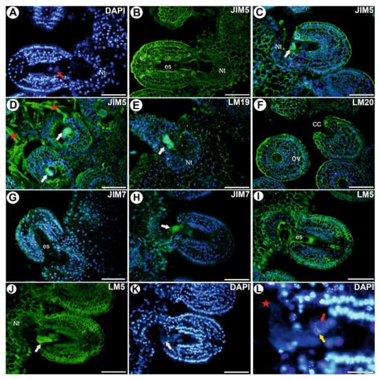 Homogalacturonan detected in an ovule of Utricularia nelumbifolia after pollination and after fertilization (Antibodies–green fluorescence). (A,B) Pectic epitope (labeled with JIM5) detected after pollination but before fertilization; mature embryo sac (es), egg cell (red arrow), placental nutritive tissue (Nt), bars 50 µm. (C,D) Pectic epitope (labeled with JIM5) detected after fertilization; synergid after it had been penetrated by the pollen tube (white arrow), pollen tube (star), placental nutritive tissue (Nt), bars 50 µm. (E) Pectic epitope (labeled with LM19) detected after fertilization; synergid after it had been penetrated by the pollen tube (white arrow), placental nutritive tissue (Nt), bar 50 µm. (F) Pectic epitope (labeled with LM20) after pollination but before fertilization; ovule (ov), hypertrophied part of the central cell (cc), bars 50 µm. (G) Pectic epitope (labeled with JIM7) after pollination but before fertilization; mature embryo sac (es), bar 50 µm. (H) Pectic epitope (labeled with JIM7) after fertilization; synergid after it had been penetrated by the pollen tube (white arrow), bar 50 µm. (I)) Pectic epitope (labeled with LM5) detected after pollination but before fertilization; mature embryo sac (es), bar 50 µm. (J,K) Pectic epitope (labeled with LM5) detected during fertilization; synergid after it had been penetrated by the pollen tube (white arrow), placental nutritive tissue (Nt), bar 50 µm. (L) Fertilization of the egg cell; note the nucleus of the sperm cell (yellow arrow) and egg cell nucleus (red arrow), pollen tube (red star), bar 20 µm.