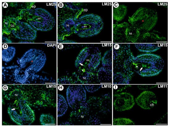 A signal from xyloglucan (labeled with LM25) was observed in the cell walls of both the somatic cells and the female gametophyte (Figure 3A–D). This xyloglucan occurred in the cell walls of the egg apparatus and in the central cell (Figure 3A). The signal was especially intense in the cell walls of the epidermal cells of the placenta (Figure 3A–D). In the ovule in which the female gametophyte development had stopped (Figure 3C,D), xyloglucan (detected by LM25) was present in the cell walls of ovule cells. The signal from xyloglucan (detected by LM15) was observed in the cell walls of the epidermal cell of the ovule, however, a very intense signal occurred in the cell walls of the synergids (also in the filiform apparatus), egg cell, and nucellus remained (Figure 3E–G). The signal from xylan (detected by LM10) was only observed in the cell walls of a few cells of the placenta or integument cells near the micropylar part of the female gametophyte (Figure 3H). The signal from xylan/arabinoxylan (detected by LM11) was observed in the cell walls of a few cells in the placenta near the micropylar part of the female gametophyte and in the cell walls of a few cells of the chalaza (Figure 3I).