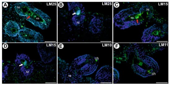 After the pollination, a signal from xyloglucan (detected by LM25) was observed in the cell walls of the placenta cells and in the female gametophyte (in the cells walls of the egg apparatus and central cell) (Figure 4A). In the fertilized ovule, this xyloglucan was observed in the cell walls of zygote (Figure 4B). After the pollination, a signal from xy-loglucan (detected by LM15) was observed in the cell walls of the egg cell and syner-gids (Figure 4C). In the fertilized ovules, the signal of LM15 was still observed near the synergid that had been penetrated by the pollen tube (Figure 4D). This xyloglucan was observed in the cell walls of pollen tubes (Figure 4D). After pollination, the signal from xylan (detected by LM10) was observed in the cell walls of a single cell at the chalaza (Figure 4E). The signal from xylan/arabinoxylan (detected by LM11, Figure 4F) was sim-ilar to the one in the unpollinated flowers.