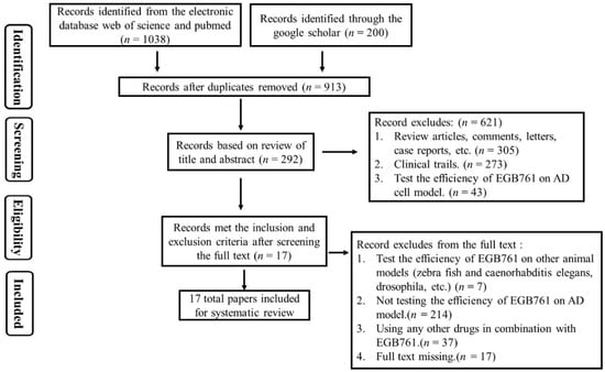 The basic search produced a total of 1038 articles from the electronic databases, Web of Science, PubMed, and Google Scholar. After browsing the titles and abstracts of the articles, we excluded 200 articles according to the following criteria: (1) Review articles, comments, letters, case reports (n = 305); (2) Clinical trials (n = 273); and (3) The efficiency of the GBE was tested on AD cell models (n = 43). Next, by carefully screening the full texts of the remaining 292 articles, 275 articles were excluded for the following four reasons: (1) The GBE was tested on nonmammalian animal models (zebra fish, Caenorhabditis elegans, drosophila, etc.); (2) The GBE was not tested on an AD model; (3) Other drugs were used in combination with GBE; and (4) The full text was missing. Finally, we included 17 articles. The details are shown in Figure 1.