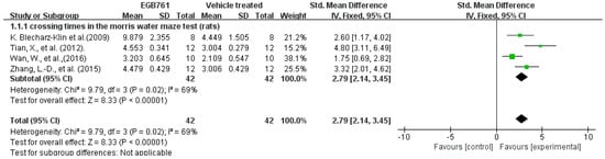 A total of 4 of the 17 (23.5%) articles detected the numbers of times crossing the target quadrant in the MWM to evaluate the spatial memory in the experimental AD animals. A total of 42 animals (rats and mice, n = 32 and n = 10, respectively) were included and treated with different doses of GBE (100 mg/kg in one article, 50 mg/kg in one article, 40 mg/kg in one article, and 20 mg/kg in one article). A total of 42 animals (rats and mice, n = 32 and n = 10, respectively) were treated as control groups. The univariate statistical analysis was conducted using Revman 5.3 software. In the experimental AD model, whether it was mice or rats, GBE significantly increased the numbers of times animals crossed the target quadrant, when compared with vehicle-treated animals (p < 0.00001), with a Std. mean difference of 2.79. Notably, the results of the forest plot show moderate heterogeneity (p = 0.02, I2 = 69%), which indicates that GBE has a potential relationship with the increased crossing times of the AD animal model. The details are shown in Figure 4.