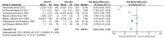 The Syndom Kurztest (SKT) and the Alzheimer’s Disease Assessment Scale Cognitive Subscale (ADAS-Cog) are two widely used cognitive tests that can accurately reflect the attention and memory deficits of AD patients [20,54]. The cognition tests, such as SKT and ADAS-Cog, were evaluated at the beginnings and the ends of the clinical trials. A total of 7 of 10 (70%) effective studies were included in the meta-analysis of AD patients in the SKT. A total of 819 patients who had been diagnosed with AD, or that had AD-like symptoms, received lower SKT scores after GBE treatment for 12 to 24 weeks. The univariate statistical analysis was conducted using Revman 5.3 software. In the forest plot, the changes in the SKT scores ranged from −3.2 to −0.0075 in the GBE treatment group, compared with −1.2 to 1.3 in the placebo group, with SMD (95%CI) = −2.44 [−2.60, −2.29]. Although the study results show that GBE can ameliorate cognitive deficits, the forest plot shows that high heterogeneity (p < 0.00001, I2 = 99%), different drug dosages, and different administration times are possible reasons for the differences between the experimental and placebo groups. The details are shown in Figure 6.