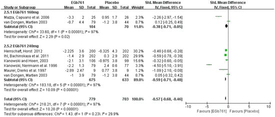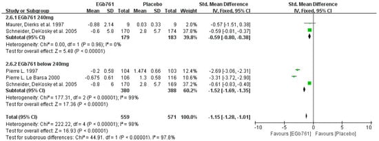 Next, the subgroup analysis of the SKT by dose included six effective studies. A total of 779 patients diagnosed with AD or cognitive impairment were treated with GBE (daily dose below 240 mg, n = 104; daily dose of 240 mg, n = 675), while 703 patients were treated with placebos (daily dose below 240 mg, n = 70; daily dose of 240 mg, n = 633). The univariate statistical analysis was conducted using Revman 5.3 software. In the forest plot, the changes in the SKT scores ranged from −3.3 to −0.7 in the GBE groups at doses below 240 mg/day, and from −1.2 to 0.95 in the placebo groups, with the SMD (95%CI) = −0.38 [−0.71, −0.05]. At the dose of 240 mg/day, the changes in the SKT scores ranged from −2.225 to −1 in the GBE groups, and from −1.2 to 2.4 in the placebo groups, with the SMD (95%CI) = −0.59 [−0.71, −0.48]. These results indicate that treating with 240 mg/day of GBE is more effective than treating with 160 mg/day. The forest plot results show high heterogeneity (p < 0.00001, I2 = 97%) in both subgroups of daily doses below 240 mg, and of daily doses of 240 mg. Differences in the drug administration times, the methods of measurement, and individual variations were the potential reasons. The details are shown in Figure 7.