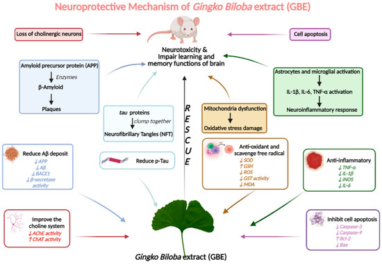 After screening the full texts of the selected articles, we found five mechanisms that have been suggested for the neuroprotective mechanisms of GBE in AD models: reducing Aβ deposits and p-Tau; anti-oxidation; antiapoptosis; anti-inflammation; and neurotransmitter balance regulation.