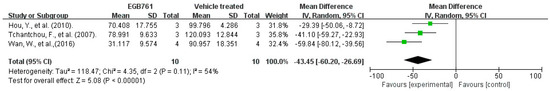 A total of 3 of the 17 (17.6%) articles detected the Aβ levels in the brain tissues with immunoblotting. A total of ten TgAPP/PS1 mice were included and treated with different doses of GBE (100 mg/kg in one article, 50 mg/kg in two articles,). Another ten TgAPP/PS1 mice were treated as a control group. The univariate statistical analysis was conducted with Revman 5.3 software. The forest plot results indicate that GBE lessened the Aβ deposits, both in the hippocampus and the cortex, compared with vehicle-treated animals (p < 0.00001), with a mean difference of 43.45. Notably, the results of the forest plot show moderate heterogeneity (p = 0.11, I2 = 54%), indicating that GBE contributed to the reductions in the Aβ deposits. The results of the Aβ deposits were consistent with those of the behavioral test analysis. The details are shown in Figure 10.