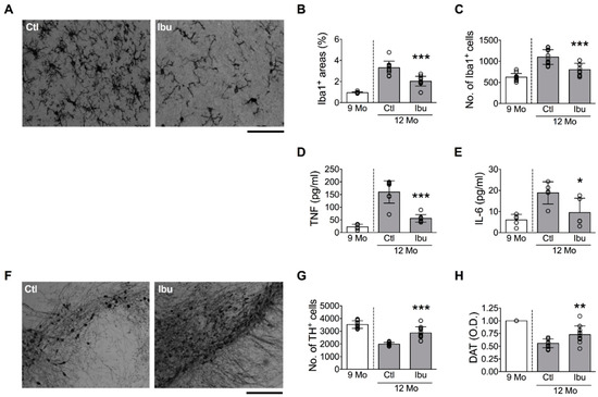 Suppression of age-related DA neuron loss in the SN by blocking microglial activation. Twelve-month-old mice were treated with (Ibu) or without (Ctl) ibuprofen for 3 months (from 9 to 12 months old). (A) Representative micrographs of Iba1+ cells in the SN. Bar = 50 μm. (B,C) Quantitative results of Iba1+ areas and numbers of Iba1+ cells. (D,E) Concentrations of TNF and IL-6 in the SN. (F) Representative micrographs of TH+ cells in the SN. Bar = 100 μm. (G) Quantitative results of TH+ cells in the SN. (H) Quantitative results of DAT+ signals in the striatum. The 9 Mo group was a reference group and was not included in the statistical analysis. * p < 0.05, ** p < 0.01, *** p < 0.001 versus Ctl group, unpaired two-tailed Student’s t-test. The numbers of mice used in the experiment are shown in Table S1. Details of statistics results are shown in Table S2.