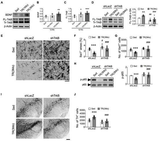 The downregulation of TrkB by shTrkB blocked the TR-induced inhibitions of age-related microglial activation and DA neuron loss in the SN. Mice were injected with shLacZ viruses into the left striata and shTrkB viruses into the right striata before and during (one injection each at 9-, 10-, and 11-month-old, respectively) the 3-month TR (TR(3Mo)). (A) Representative Western blots of BDNF and TrkB in the SN. (B,C) Quantitative results of BDNF and TrkB levels. * p < 0.05, ** p < 0.01, *** p < 0.001 versus Sed group, one-way ANOVA, Bonferroni’s post hoc test. (D) Relative levels of FL-TrkB. Left panels: representative Western blots; right panel: quantitative results. (E) Representative micrographs of Iba1+ cells in the SN. Bar = 20 μm. (F,G) Quantitative results of the areas and numbers of Iba1+ cells. (H) Relative levels of p-p65. Left panels: representative Western blots; right panel: quantitative results. (I) Representative micrographs of TH+ cells in the SN. Bar = 100 μm. (J) Quantitative results of TH+ cells. ** p < 0.01, *** p < 0.001 versus respective Sed group; # p < 0.05, ## p < 0.01, ### p < 0.001 versus respective shLacZ group, two-way ANOVA, Bonferroni’s post hoc test. The numbers of mice used in the experiment are shown in Table S1. Details of statistics results are shown in Table S2. Full-length blots are presented in Figure S2.