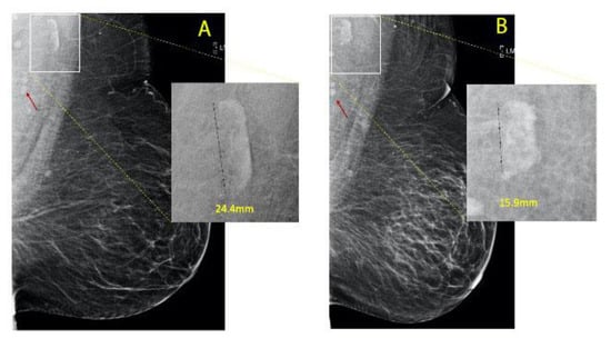 Left medio-lateral oblique mammogram before ((A), 2016) and after ((B), 2019) bariatric surgery. FIN (black dotted line) changed in size from 24.4 mm to 15.9 mm corresponding to a weight loss of 24.2 kgs. Normal lymph nodes for comparison ((A,B), red arrows). There is an associated decrease in the size of the right breast due to marked weight loss and decreased breast adipose tissue.