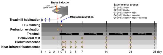 The experimental design included the temporal distribution of pre- and post-stroke induction evaluations, as well as the experimental groups (G1–G5). Treadmill habituation at −4, −3, −2 days before stroke induction, TTC staining at 1 day after stroke induction, perfusion evaluation pre- and post-stroke induction, treadmill physical training for 4 weeks (5 days per week), behavioral testing at −1 (control), and 7, 14, 21, and 28 days. At 4 h (28 h after stroke induction), and 1, 3, 5, 7, 14, and 21 days following MSC delivery, bioluminescence and near-infrared fluorescence were observed. Abbreviations: TTC (2,3,5-triphenyltetrazolium chloride staining); MSC (mesenchymal stem cells).