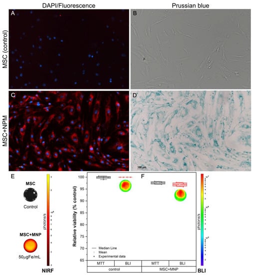 Internalization and viability of fluorescence–magnetic nanoparticles labeled mesenchymal stem cells. (A) Fluorescence microscopy image of unlabeled MSC at 10×, (B) Brightfield microscopy image of unlabeled MSC at 10×, (C) TRITC and DAPI fluorescence microscopy images of MSC labeled with 50 µg Fe/mL of MNP, displayed at 10×, (D) Brightfield microscopy image of MSC labeled with 50 µg Fe/mL of NP, shown at 10×, (E) NIRF signal of MSC labeled with 50 µg Fe per mL of MNP, and (F) Cellular viability of MSC following labeling in MTT (gray bars) and BLI (red bars) assays, respectively. A red–yellow scale bar represented the NIRF intensity in photons per second, and the BLI intensity in photons per second was represented by blue–red scale bar. Abbreviations—MSC: mesenchymal stem cells from the human bone marrow; MNP: magnetic nanoparticles; MTT: the 3-[4,5-dimethylthiazol-2-yl]-2,5 diphenyl tetrazolium bromide; BLI: bioluminescent images.