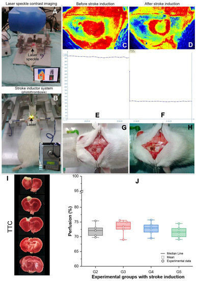 Local blood perfusion analysis with a PeriCam Perfusion Speckle Imager (PSI) system (Perimed, Stockholm, Sweden) was used to confirm the focal ischemic brain lesion, comparing baseline perfusion to perfusion in the ischemic areas after induction (effective ischemia being considered to be around 70% of blood decrease) [24,25]. As described in a previous study [26], TTC staining was conducted after 24 h of ischemic lesion induction. The infarcted area is indicated by TTC-unstained brain tissue, while the viable brain area is indicated by TTC-stained tissue [27].