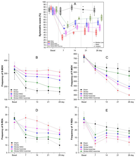 The frequency of slow (Figure 5D) and fast (Figure 5E) vertical movements did not vary significantly over time, according to visual examination (Figure 5D,E). Slow movements continued to discretely decrease after a substantial decline in movement frequency at the start of the analysis due to stroke induction (at day 7 of Figure 5D,E). The fast movements of the experimental groups (all symbols except the black squares of Figure 5E) had a great recovery with frequency increase at 14 days, though the group that received cells and exercise (green circles in Figure 5E) had a higher recovery, approaching the movement pattern of the sham group (back squares in Figure 5E), compared to the other experimental groups, which only received cells (blue squares in Figure 5E) or exercise only (red stars in Figure 5E). As a result, slow movements continued to deteriorate over time following the initial decline, probably as a compensation for the rise in fast movements. Only fast vertical movement had a continual increase in frequency after the 7th day of evaluation, indicating that the acute-stage recovery was more important than the test habituation impact.
