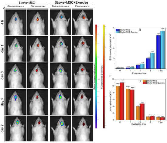Evaluation of bioluminescence and fluorescence signal in the “stroke + MSC” (G3) and “stroke + MSC + exercise” (G5) groups, in the following conditions: 4 h and 1, 3, 5, 7, 14, and 21 days after the administration of MSC labeled with MNP. (A) BLI and NIRF signal representations in the “stroke + MSC” (G3) and “stroke + MSC + exercise” (G5) groups over the time with detectable signal for both techniques (until 7 day); (B) The graphic of the BLI signal intensity of groups analyzed over time; and (C) The graphic of the NIRF signal intensity of groups analyzed over time.