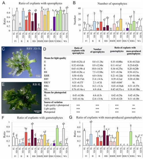 Gametophytes were the most frequently obtained in the cultures under photoperiod 8L and RB, RBG and Wh lights (Figure 1D–F). The mass production of gametophytes occurred under six of the nine tested light spectra, i.e., Fl, B, R, RB, RBY, and RBG (Figure 1G). A statistical analysis confirmed that RB light was the most suitable for the gametophyte formation with high effectiveness (Figure 1D,E).