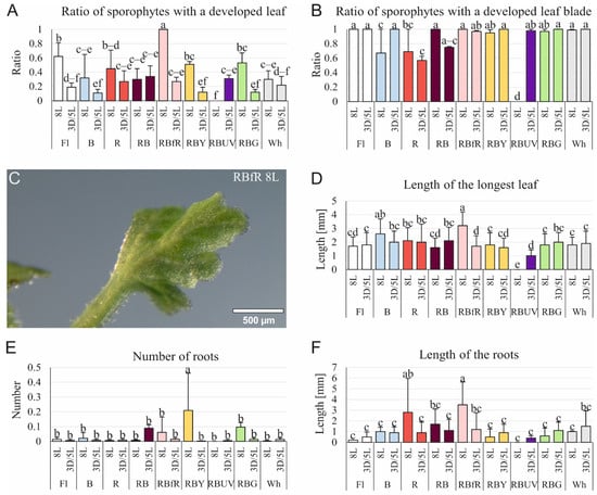 Light conditions affected the biometrical properties of the C. delgadii sporophytes (Figure 2). The greatest ratio of sporophytes with a developed leaf blade was obtained under the RBfR light spectrum in the culture without a 3-week-long dark period (Figure 2A). The lowest ratio of sporophytes with a developed leaf blade was obtained under RBUV light (8L) (Figure 2B); however, most of the tested light conditions had a positive influence on this parameter (Figure 2B,C). The RBfR light (8L) promoted the elongation of leaves. Under this light, the mean length of the longest leaf was equal to 3.2 mm (Figure 2D). The number of roots was stimulated by the RBY light spectrum (8L) (Figure 2E). The mean length of the roots under RBfR (8L) light was enhanced in comparison to most of the other light conditions and equalled 3.5 mm (Figure 2F).