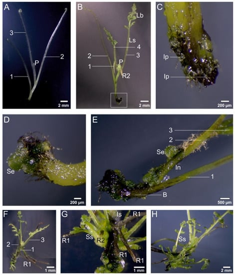 After 3 weeks of culture, intensive proliferation was visible at the base of these sporophytes (Figure 3C). One week later, somatic embryos were observed at those locations (Figure 3D). After 5 weeks of culture, the somatic embryos were also formed on the internodes located between the first and second leaf of the sporophytes (Figure 3E). Long roots of the initial sporophytes were abundantly observed (Figure 3F). The somatic embryo-derived juvenile sporophytes rapidly developed, and their roots and well-developed leaf blades were noticed after 7 and 8 weeks of culture, respectively (Figure 3G,H).