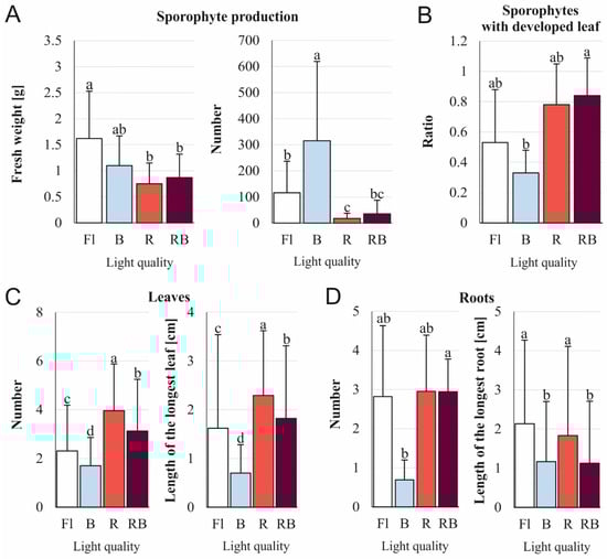 Effect of different light quality on fresh weight and biometrical properties of growth of Cyathea delgadii sporophytes after in vitro propagation under: Fl—fluorescent light; B—100% blue LED light; R—100% red LED light; RB—combination of red (70%) and blue (30%) LED light. The effect on 5-month-old etiolated sporophytes was estimated after 6-month-long culture. (A) Fresh weight of proliferated plants and number of obtained sporophytes. (B) Ratio of sporophytes with a developed leaf. (C) Number of leaves and length of the longest leaf. (D) Number of roots and length of the longest root. Mean ± standard deviations marked by different letters are significantly different (p ≤ 0.05) following Dunn–Bonferroni test.