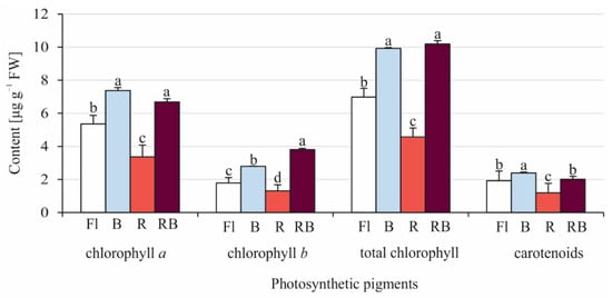 The level of photosynthetic pigments was measured with a spectrophotometric method. Cut leaf samples (200 mg) were homogenised in a mortar and dissolved in 80% acetone. After filtration, the absorbance was measured using a UV/VIS Helios Alpha spectrophotometer (Unicam Ltd., Cambridge, UK). The absorbance was measured at the following wavelength maxima: 663.2 nm, 646.8 nm, and 470 nm for chlorophyll a, chlorophyll b, and carotenoids, respectively. The content of chlorophyll a, chlorophyll b, and total carotenoids was calculated according to the methodology of Lichtenthaler and Buschmann [] and total chlorophyll according to the work of Khasanah and Maryani []. Tree biological replicates were processed per light condition.