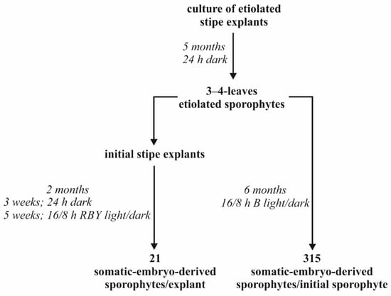 The etiolated 5-month-old sporophytes of C. delgadii with 3–4 developed leaves were used as the source of plant material. They were cultured on hormone-free half-strength macro- and micronutrients Murashige and Skoog’s medium (1/2 MS) [] supplemented with full composition of vitamins and 2% (w/v) sucrose. The medium was solidified with 0.7% plant agar. Its pH was adjusted to 5.8 before autoclaving. Fifty mL of the medium was poured into glass jars of 190 mL each. The cultures of donor sporophytes as well as experimental cultures were maintained in a climatic chamber at 24 ± 1 °C.