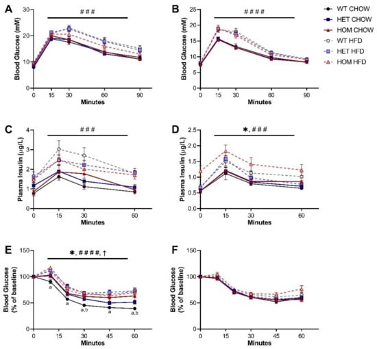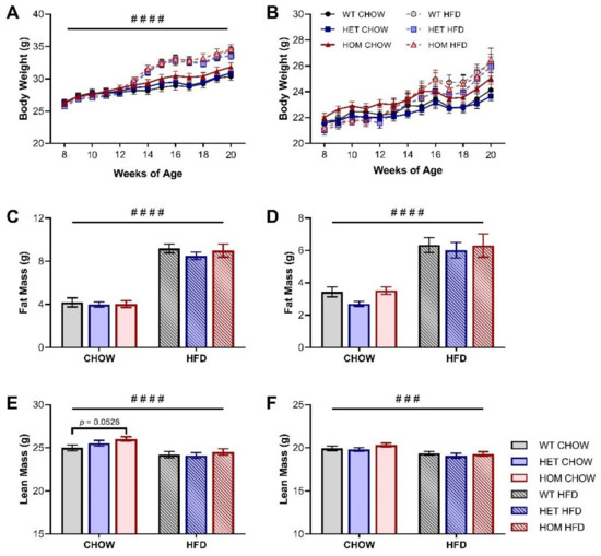 Data were analyzed by a standard or repeated measures 2-way ANOVA or 3-way ANOVA, with genotype, diet, and feeding state as the relevant factors where appropriate. Where a significant main effect was identified for any of the factors by the ANOVA, a Dunnett’s or Sidak’s post hoc test was conducted to determine differences between groups. Male and female mice were analyzed separately due to known differences in body composition and susceptibility to diet-induced metabolic dysfunction [20,21]. Values are presented as mean ± SEM, with statistical significance accepted at p < 0.05. Statistical analysis was performed in GraphPad Prism software (Prism 8, Version 8.0.2, GraphPad Software, San Diego, CA, USA).