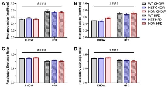 Given that CREBRF has been previously associated with altered cellular bioenergetics [1], we additionally performed indirect calorimetry to determine whether the R458Q variant impacted measures of whole-body energy metabolism and expenditure in our knock-in mouse model. Whole-body energy expenditure (as measured by heat production) was significantly increased for HFD-fed male and female mice compared to their chow-fed counterparts (Figure 3A,B), while as expected HFD-fed mice exhibited a significantly lower respiratory exchange ratio (RER) than their chow-fed counterparts (Figure 3C,D). No differences were observed between genotypes for either parameter.