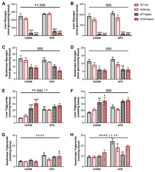 As a broad measure of tissue nutrient homeostasis, glycogen and triglyceride contents were measured in both liver and muscle. Glycogen stores in both tissues were as expected significantly depleted by the overnight fasting for all mice, with a greater decline observed in the liver (Figure 4A–D). The presence of the Crebrf Arg457Gln variant in male mice did not significantly impact glycogen content in either tissue, but in the fasted state there was a trend for variant-induced reductions. There was an overall trend (p = 0.0565) for female liver glycogen to be reduced in HOM mice, and unlike the males, this was more prominent in animals in the fed state (Figure 4B); the pattern was reflected also in quadriceps glycogen content (Figure 4D). Hepatic triglyceride accumulation in chow-fed male mice was significantly increased by fasting, with a trend (p = 0.07) for a main effect of the variant on this parameter (Figure 4E). HFD blunted the fasting and genotype-induced triglyceride changes (Figure 4E). Female mice exhibited a similar overall pattern in hepatic triglyceride levels among both chow- and HFD-fed animals, but without significant genotype effects (Figure 4F). Muscle triglycerides were predominantly influenced by the HFD in both male and female mice (Figure 4G,H). Female muscle displayed a significant interaction between genotype and fed state, and between fed state and diet, with the overnight fast associated with a relative decrease in triglyceride levels in HFD-fed WT animals but not their HOM counterparts.