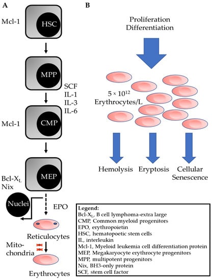 Mature human erythrocytes display a life span of approximately 120 days [7] before being removed from circulation. The relatively long life span of these cells is explained by two mechanisms: (i) during the last two stages of differentiation, the cells extrude two important organelles which play crucial roles in apoptosis pathways, i.e., the nucleus and the mitochondrion, and (ii) the cells express high levels of antiapoptotic proteins, such as myeloid leukemia cell differentiation protein (Mcl-1) and B cell lymphoma-extra-large (Bcl-XL). These proteins are already expressed during the different developmental stages of erythropoiesis (Figure 1A, [3]).
