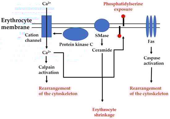 - Lang, K.S.; Myssina, S.; Brand, V.; Sandu, C.; Lang, P.A.; Berchtold, S.; Huber, S.M.; Lang, F.; Wieder, T. Involvement of ceramide in hyperosmotic shock-induced death of erythrocytes. Cell Death Differ. 2004, 11, 231–243. [Google Scholar] [CrossRef] [PubMed]