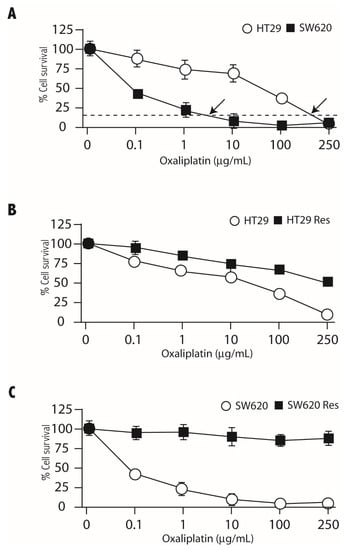 Oxaliplatin-resistant cells were isolated by incubation with a single dose of the drug. Oxaliplatin sensitivity of HT29 and SW620 cells was determined in 2D culture to establish the drug concentration that decreased cell survival by 80% (IC80) (Figure 2A). These concentrations were 160 µg/mL for HT29 cells and 6 µg/mL for SW620 cells (indicated by a dotted line and arrows in Figure 2A). Oxaliplatin-resistant cells were obtained by culturing HT29 and SW620 cells in the presence of the IC80 concentration of the drug for three days. Oxaliplatin sensitivity of the cells that survived this single-dose treatment was determined, as shown in Figure 2B,C. Surviving cells showed decreased sensitivity to oxaliplatin in both cells lines and were considered resistant cells. Resistance was maintained after several weeks of culture and after freezing and re-culturing of the cells.