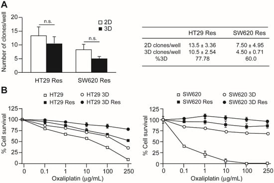 Clonogenic capacity and oxaliplatin sensitivity of oxaliplatin-resistant CRC cells. Panel (A). Oxaliplatin-resistant HT29 (HT29Res) and SW620 (SW620Res) cells were cultured in 96-well plates at a density of 46 cells/plate for 10 days. Control cells were cultured in adherent plates (2D, open squares), while CSCs were cultured in non-adherent plates and defined media (3D, black squares). The number of clones obtained in each plate is represented in the left graph and indicated in the table to the right. Panel (B). Oxaliplatin sensitivity was determined by culturing the HT29 (left panel) or SW620 (right panel) cells in the presence of the indicated concentrations of oxaliplatin for 3 days. Cell survival was determined for each point and represented as percentage of survival in relation to the cell culture in the absence of the drug. Open squares represent the original cell population, black squares (Res) represent the population of cells that was made resistant to oxaliplatin, open circles represent untreated cells cultured under non-adherent (3D) conditions, and black circles represent oxaliplatin-resistant cells cultured under non-adherent conditions (3D Res). Experiments were repeated three times with similar results. Statistics: NS: non-significant differences.