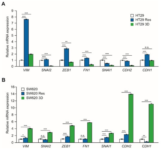 Expression of mRNAs coding for proteins involved in epithelial-mesenchymal transition (EMT). RNA was isolated from CRC cells cultured in adherent plates, non-adherent plates in defined medium (3D), and oxaliplatin-resistant cells cultured under adherent conditions (Res). The relative expression of the mRNAs coding for the protein Vimentin and the transcription factors SNAI1 (SNAIL), SNAI2 (SLUG), Zinc finger E-box-binding homeobox 1 (ZEB1), Fibronectin 1 (FN1), neural cadherin (N-cadherin), and Epithelial cadherin (E-cadherin) was determined by RT-qPCR. Panel (A) shows the results obtained for HT29 cells and panel (B) shows those obtained for SW620 cells. Experiments were repeated three times with similar results. Statistics: NS, non-significant differences; * p < 0.05; ** p < 0.01; *** p < 0.001.
