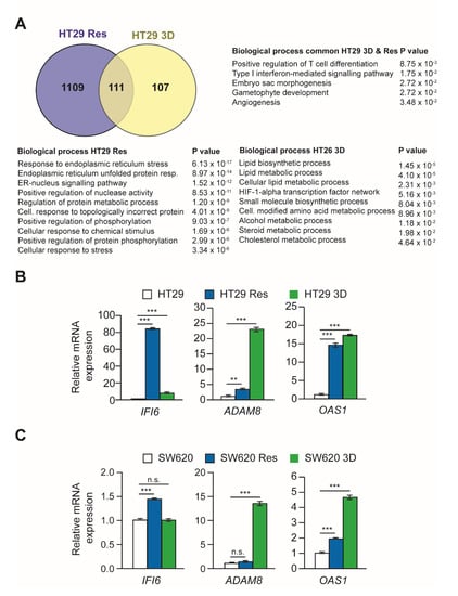 Comparative analyses of differential mRNA expression in HT29 oxaliplatin-resistant and 3D-cultured cells. Panel (A). mRNA was isolated from HT29 cells cultured under 2D conditions, oxaliplatin-resistant HT29 cells cultured under 2D conditions, and HT29 cells cultured under 3D conditions. Global mRNA expression levels were determined by RNA sequencing (RNAseq). Differentially expressed genes between HT29 oxaliplatin-sensitive and -resistant cells were identified (blue circle). Genes differentially expressed between HT29 cells cultured under 2D or 3D conditions were also determined (yellow circle). Finally, differentially regulated genes in these two conditions were compared and a Venn diagram of commonly regulated genes is represented. The main biological processes significantly over-represented in the genes differentially expressed in the three comparisons are shown. Panels (B,C). Comparison of the relative expression of three representative differentially expressed genes in cells cultured under 2D conditions, either sensitive or resistant (Res) to oxaliplatin, and cells cultured under 3D conditions (3D). Panel B represents the results obtained for HT29 cells, and panel C represents those obtained for SW620 cells. The mRNAs analyzed code for the proteins interferon-gamma inducible protein 6 (IFI6), ADAM Metallopeptidase Domain 8 (ADAM8), and 2′-5′-Oligoadenylate Synthetase 1 (OAS1). Experiments were repeated three times with similar results. Statistics: NS: non-significant differences; ** p < 0.01; *** p < 0.001.