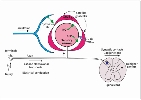 - Huang, L.Y.; Gu, Y.; Chen, Y. Communication between neuronal somata and satellite glial cells in sensory ganglia. Glia 2013, 61, 1571–1581. [Google Scholar] [CrossRef] [Green Version]