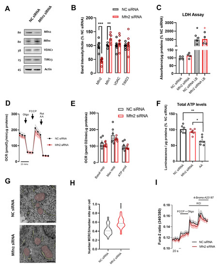 Firstly, we modulated MERCS by treating cells with either negative control (NC) siRNA or Mfn2 siRNA for 72 h (Figure 1A). Knock-down (KD) of Mfn2 was validated through western blotting, revealing an average decrease of 55% in Mfn2 levels (Figure 1A,B, p ≤ 0.001), while neither the outer mitochondrial membrane resident protein VDAC nor the inner mitochondrial membrane resident protein TIM23 levels were affected (Figure 1A,B), hence suggesting that the treatment did not alter overall mitochondrial mass. No differences were detected in LDH-release in either condition (Figure 1C), confirming that Mfn2 KD did not affect overall cell viability. Furthermore, we assessed mitochondrial health by analyzing the oxygen consumption rate and total cellular ATP levels in NC and Mfn2-KD SH-SY5Y cells. There were no significant differences in either the OCR parameters assessed (Figure 1D,E) nor in the total ATP levels (Figure 1F) when Mfn2 was downregulated, compared to NC siRNA conditions.