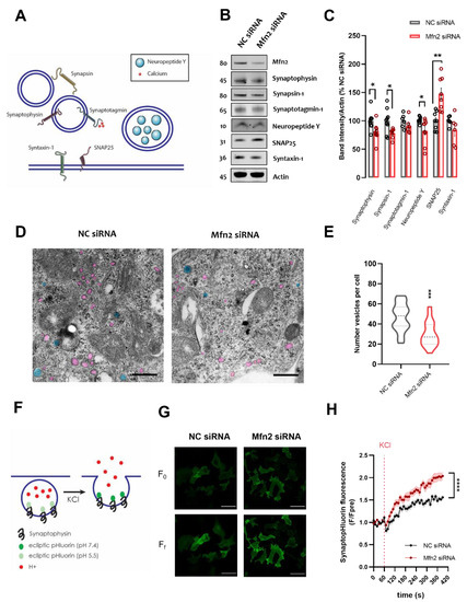 Mfn2 down-regulation decreases vesicular protein levels and vesicle number, while increasing SNARE SNAP25 protein levels and SynaptopHluorin (SypHy) fluorescence. (A) Schematic representation of some of the proteins involved in vesicular release mechanisms (B) Representative immunoblots of NC siRNA or Mfn2 siRNA SH-SY5Y cell homogenates. Blots were probed with antibodies against Mfn2, Synaptophysin, Synapsin-1, Synaptotagmin-1, Neuropeptide Y, SNAP25, Syntaxin-1 and actin which was used as a loading control (C) Bar graph shows the amounts of protein analyzed once standardized to actin content in each sample (n = 6–9 independent cultures) (D) Representative TEM pictures of NC siRNA or Mfn2 siRNA SH-SY5Y cells showing vesicles (pink) and dense core vesicles (blue). Scale bar = 500 nm. (E) Violin plots show quantification of number of vesicles per cell (four independent cultures, five cells analyzed per culture) (F) Schematic representation showing the mode of action of SypHy construct upon KCl depolarization (G) Representative confocal images of SH-SY5Y cells treated with NC siRNA or Mfn2 siRNA. Panels show initial fluorescence (F0) and final fluorescence (Ff). Scale bar = 10 µm (H) Graph shows normalized SypHy fluorescence over time in NC siRNA or Mfn2 siRNA, each timepoint (F) was normalized to average pre-stimulation fluorescence levels (Fpre). After one minute of basal recording, cells were depolarized with 50 mM KCl (n = 18–19 cells from 4 independent cultures). The ratiometric difference between Ff/F0 was shown to be significant p ≤ 0.0001. * p ≤ 0.05, ** p ≤ 0.01, *** p ≤ 0.001, **** p ≤ 0.0001.